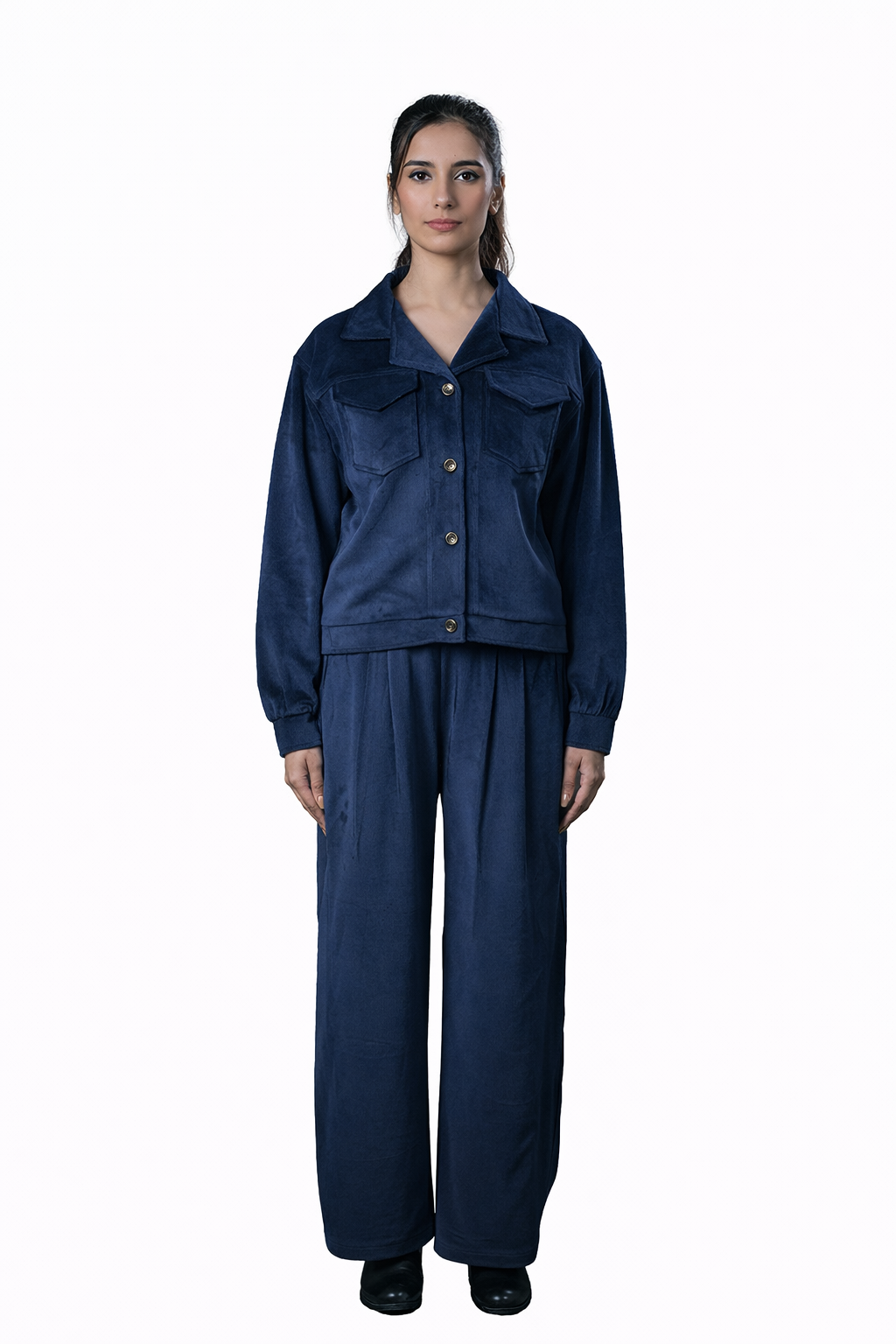 Command attention with the Blue Velvet Co-Ord Set– Women a symbol of refined confidence and modern femininity. This luxurious two-piece set features a structured button-up jacket with statement flap pockets and matching wide-leg trousers, all tailored from rich, soft velvet. The deep sapphire tone adds a touch of mystique, perfect for winter evenings, formal events, or upscale casual wear.