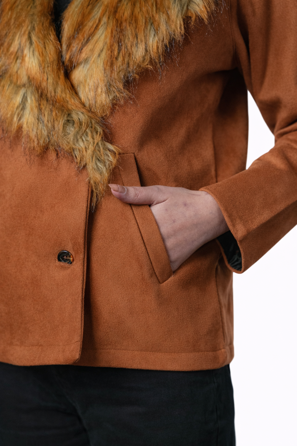 Turn heads this season with our Brown Fur Collar Jacket, a statement piece that perfectly balances warmth and luxury. Crafted with a velvet-textured exterior and a sumptuous faux fur collar in warm golden tones, it’s your go-to outerwear for cozy yet chic winter styling. The structured silhouette and soft finish make it ideal for casual days or elevated evenings.