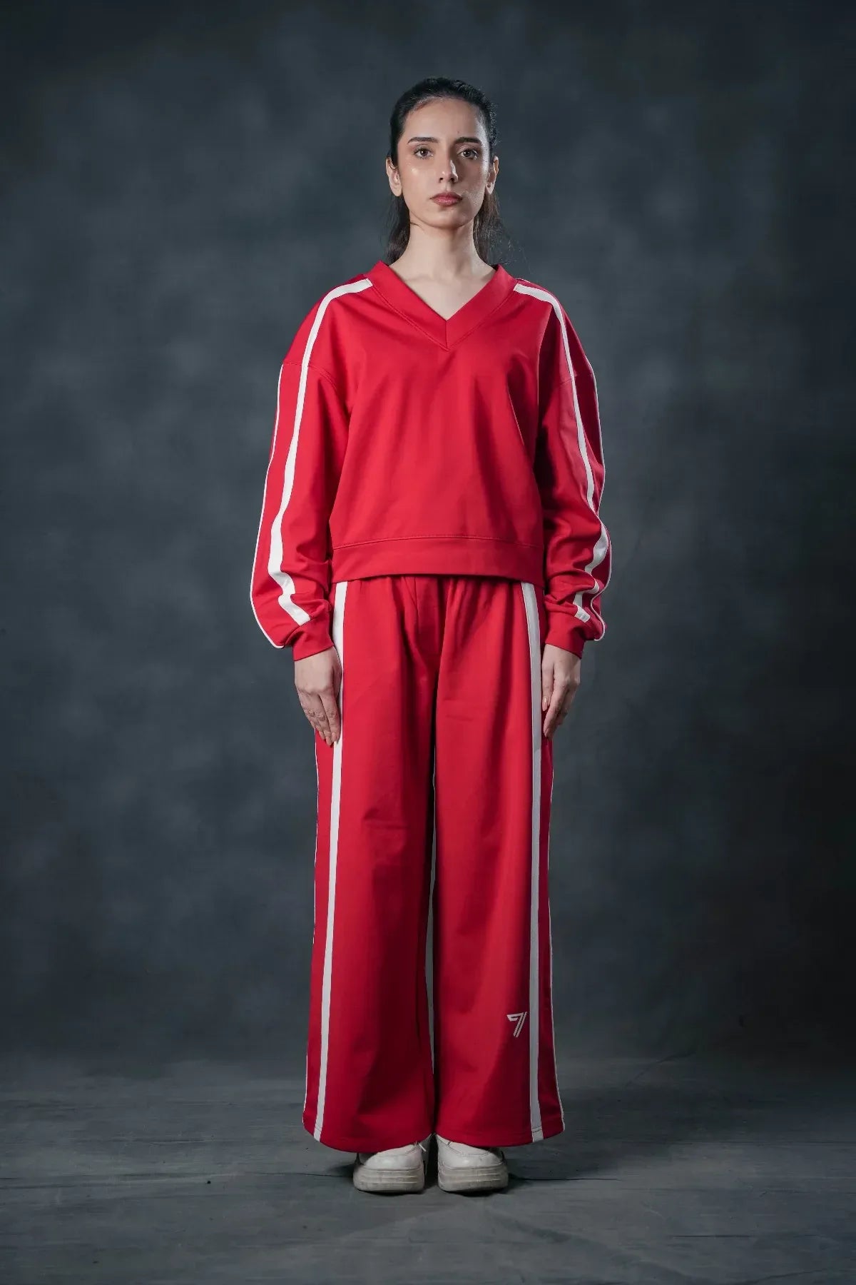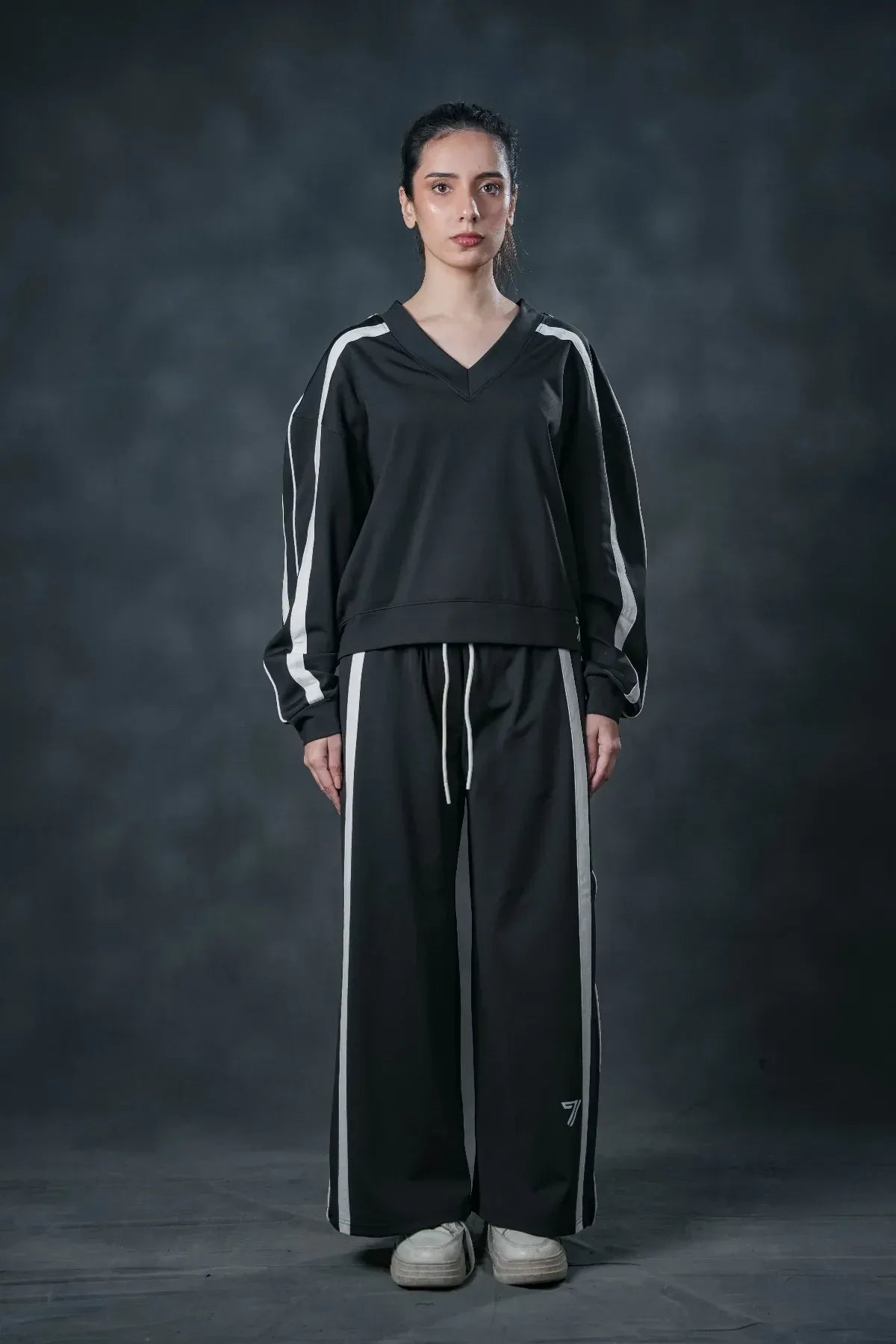 Featuring a relaxed V-neck top and wide-leg trousers accented by crisp white side stripes, this outfit brings a sporty yet sleek vibe perfect for everyday wear, travel, or casual meetups.