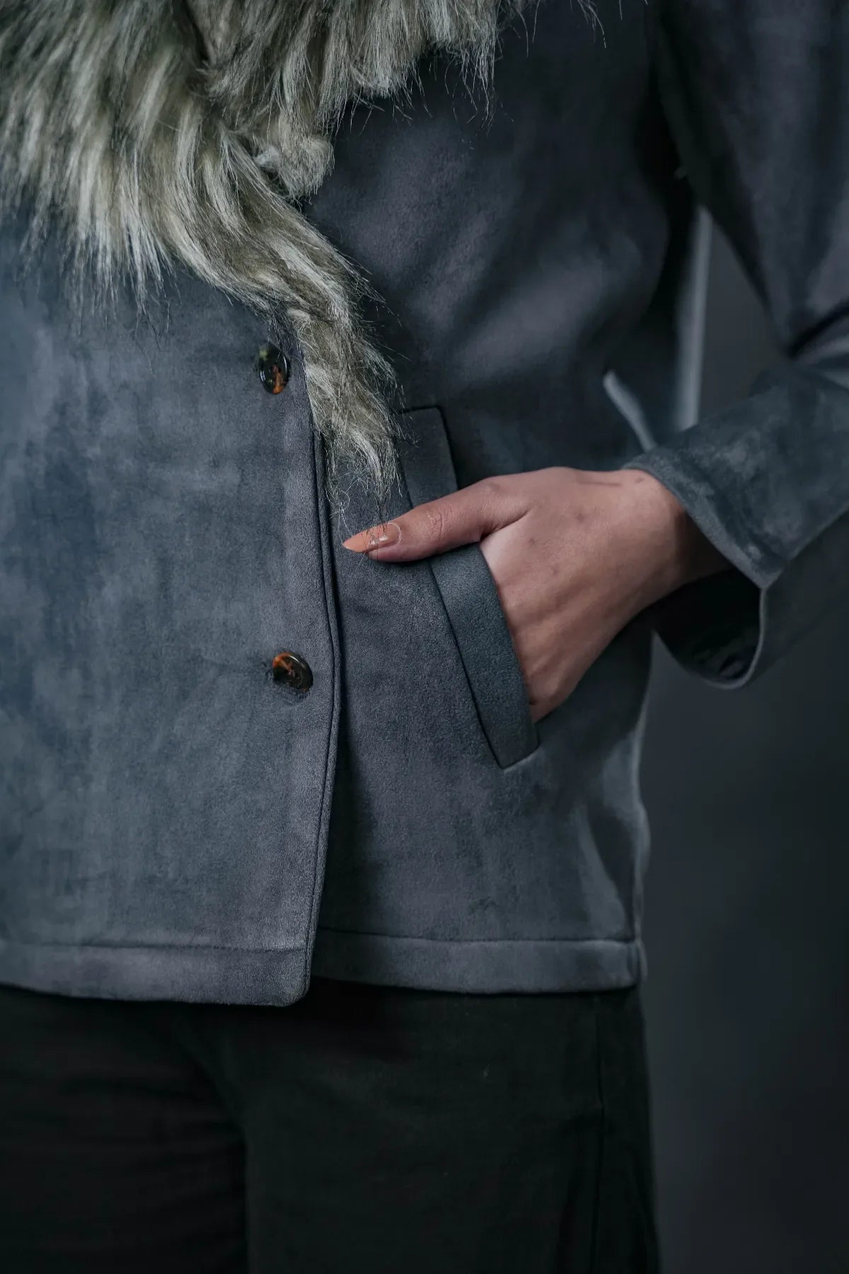 Wrap yourself in luxury with our Faux Fur Collar Puffer Jacket. Designed in a rich smoke grey velvet finish, this jacket brings warmth, elegance, and edge all in one. The soft faux fur collar adds a touch of glam, while the double-button closure and relaxed cut keep it effortlessly chic. Ideal for chilly days and cozy evenings — this jacket redefines winter sophistication.