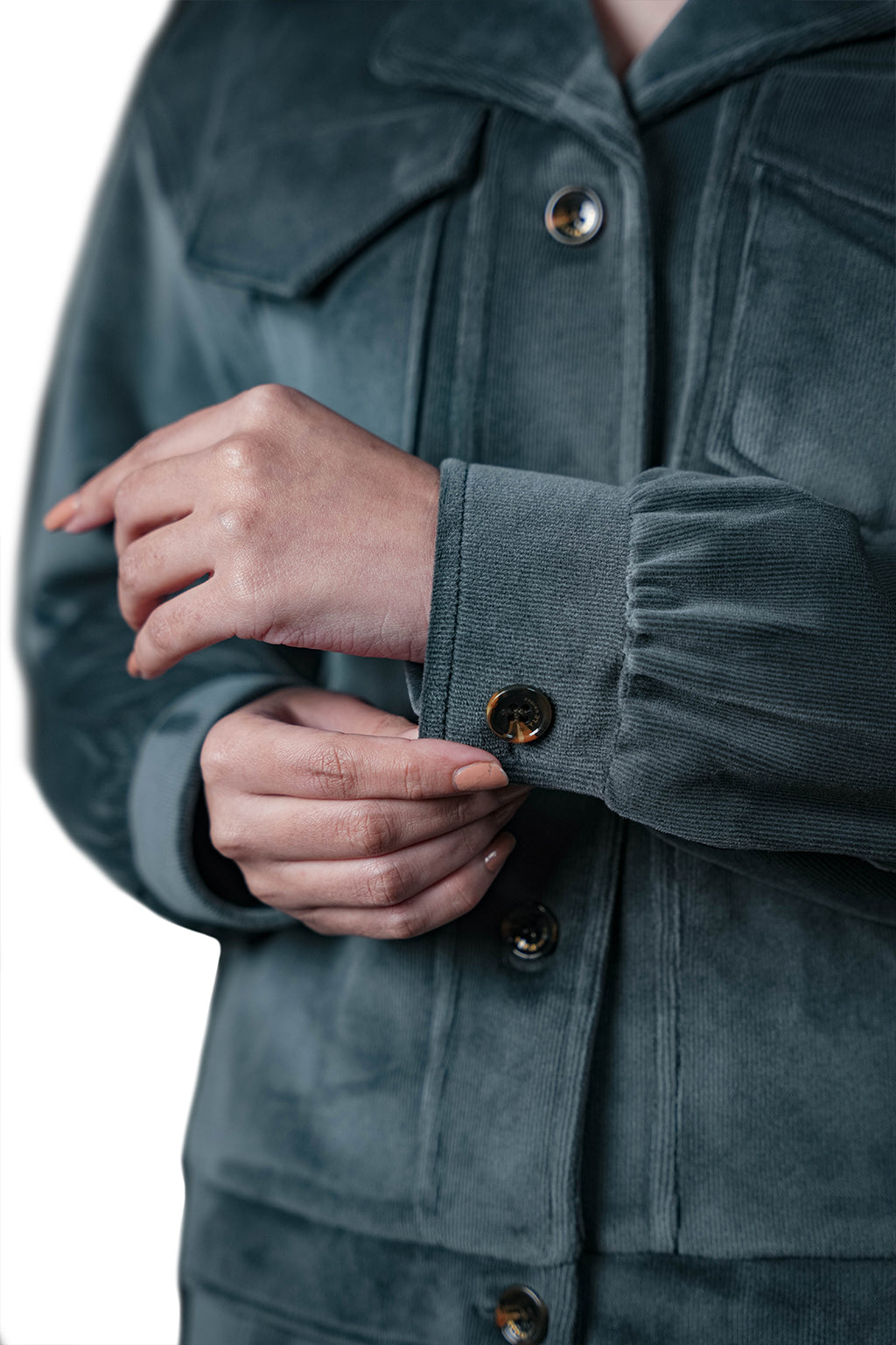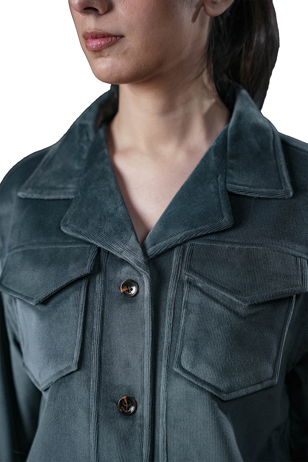 Front-button closure and flap pocket details