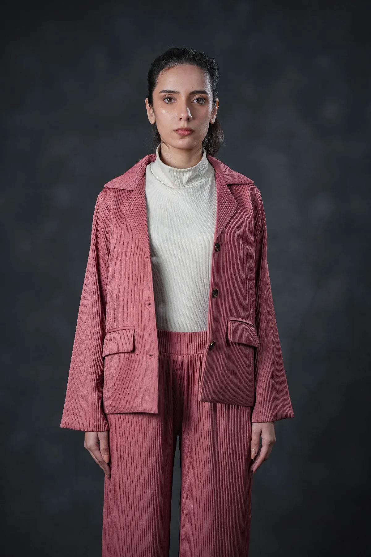 Soft, graceful, and endlessly chic — the Rosé Velvet Harmony Upper captures feminine strength in subtle luxury. Designed in a romantic blush-pink hue, this textured velvet jacket drapes effortlessly over the body, creating a refined yet relaxed silhouette. Its tailored lapel collar and structured flap pockets blend classic sophistication with modern comfort.