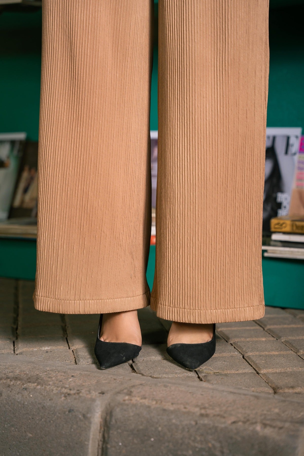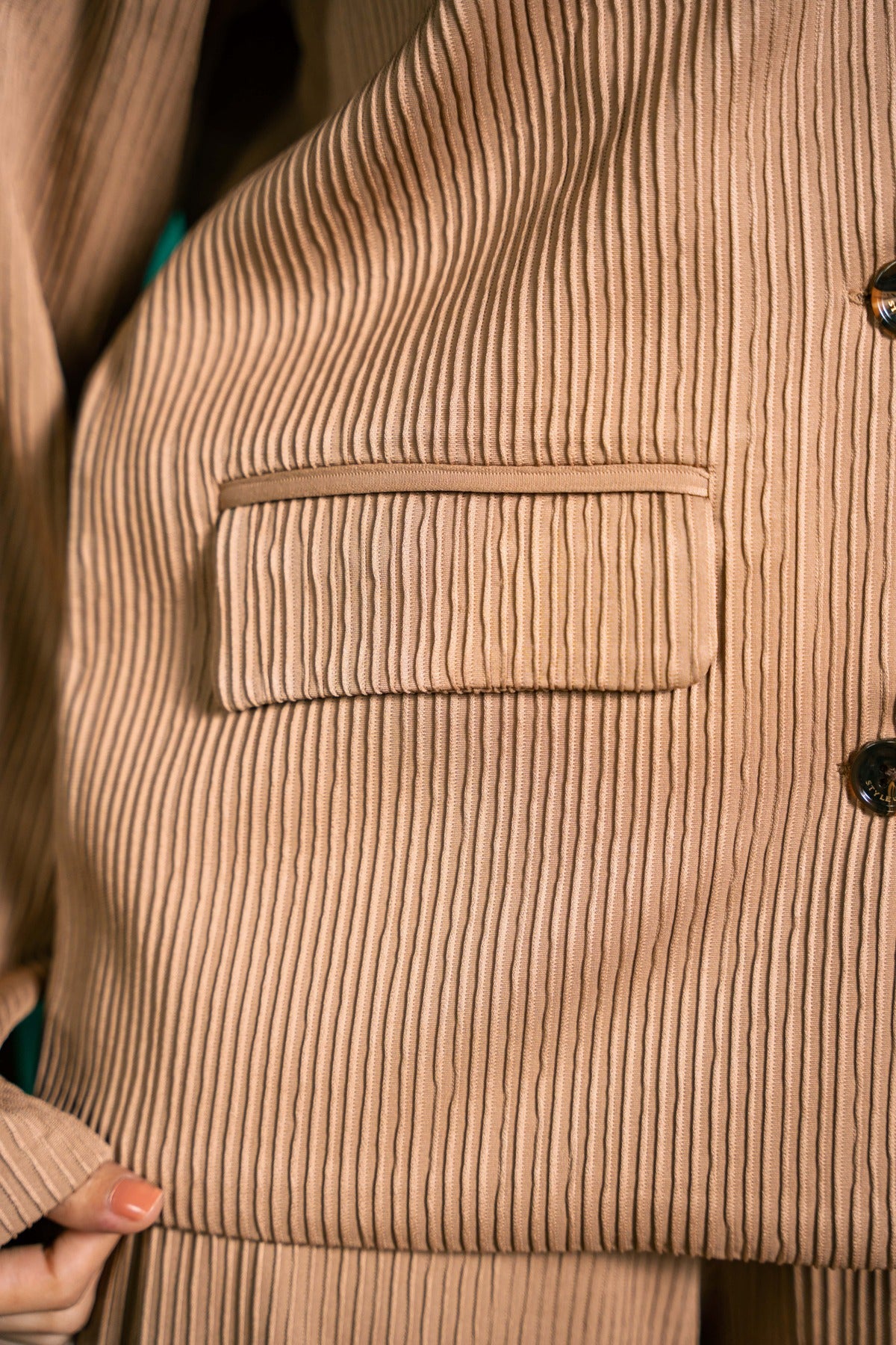Introduce sophisticated texture to your wardrobe with the SEVEN Women's Camel Plissé Set. This stunning two-piece ensemble is made from a soft, fluid fabric featuring fine vertical plissé pleats (ribbed texture). The set includes a relaxed, unlined blazer with wide, flared sleeves and matching wide-leg trousers. The warm camel-brown color and contemporary silhouette make this set an effortlessly stylish choice for the office, evenings out, or travel.